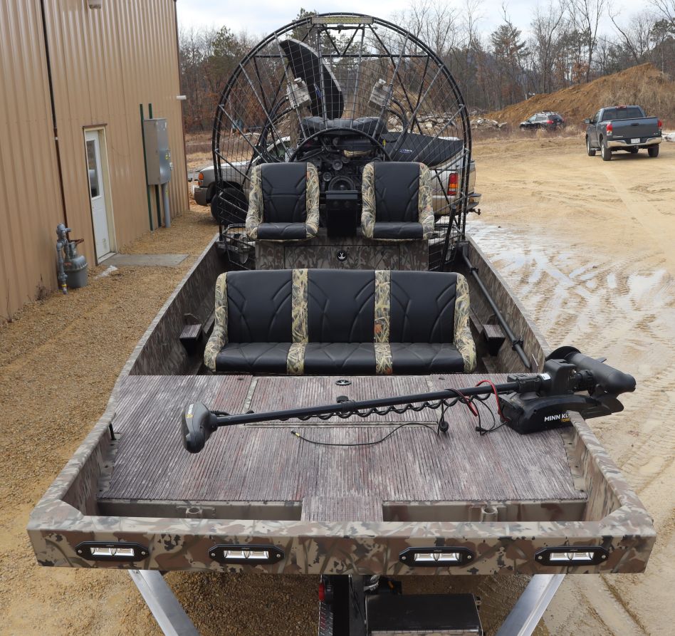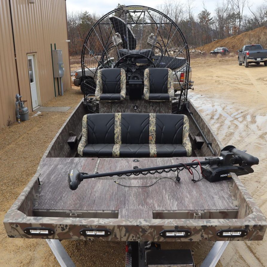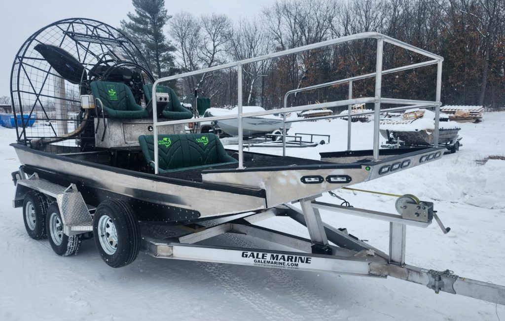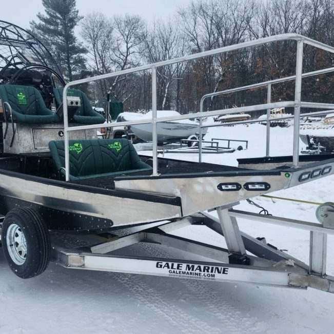 Our standard Gale Marine Custom Airboat hull is robust, made with .190″ 5086 aluminum. This makes for an extremely durable hull along with 7-11 full length longitudinal stringers, depending on boat size. We use 3/8″ UHMW polymer on bottom and sides of our boats to absorb impact from the abuse we see on airboats, especially those used on ice.