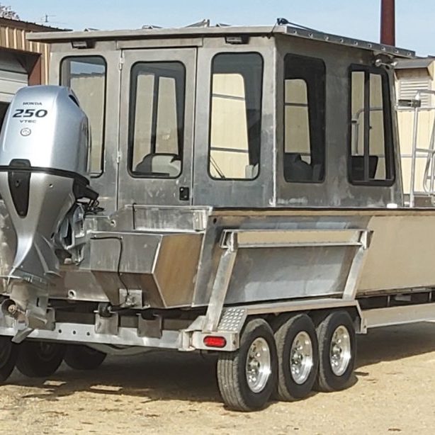 Looking for a new boat trailer? We build custom corrosive-resistant aluminum single or tandem axle heavy-duty trailers for any boat. Our standard boat trailer features 3499# axles, 14″ galvanized wheels, and stand-on treadplate fenders making it easy to get in and out of the boat. We also build steel trailers if you prefer – galvanized or painted black.